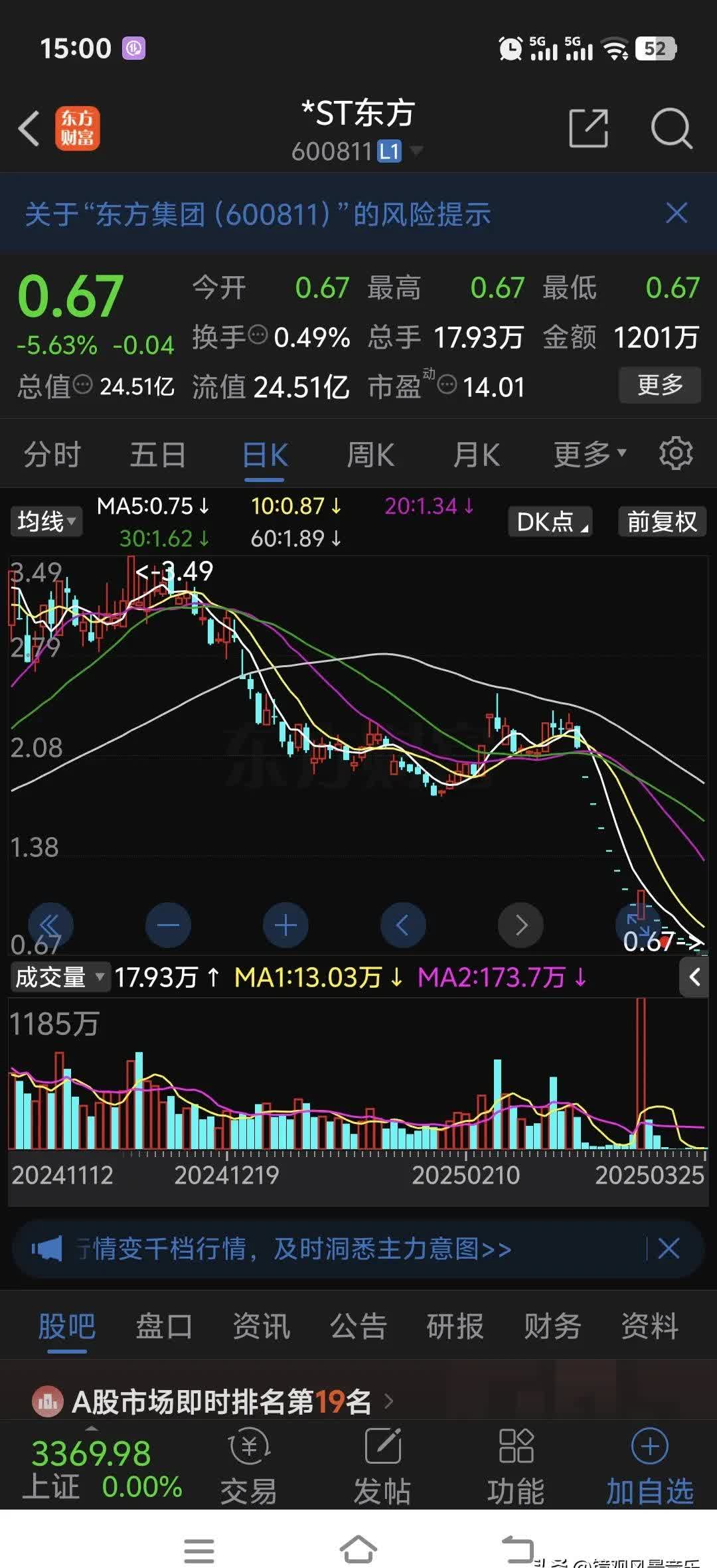 4、我熟人的同事100多万全仓一只股票东方集团踩雷了,割肉60%卖了,还有一股民全仓买了紫天科技踩雷,几乎归零,现在去送外卖了。