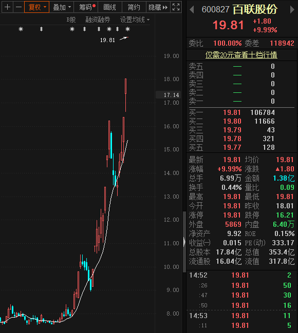 2、关于股票百联股份和股票绿地控股的简要分析 股票百联股份免税概念百联股份因其控股股东已提出免税品经营资质申请,近期受到市场关注免税概念的炒作使得该股票近期出现异常波动,有接力市场高度板的潜力,但需关注前期免税股王府井的走势对其影响新零售与上海国资控股作为。